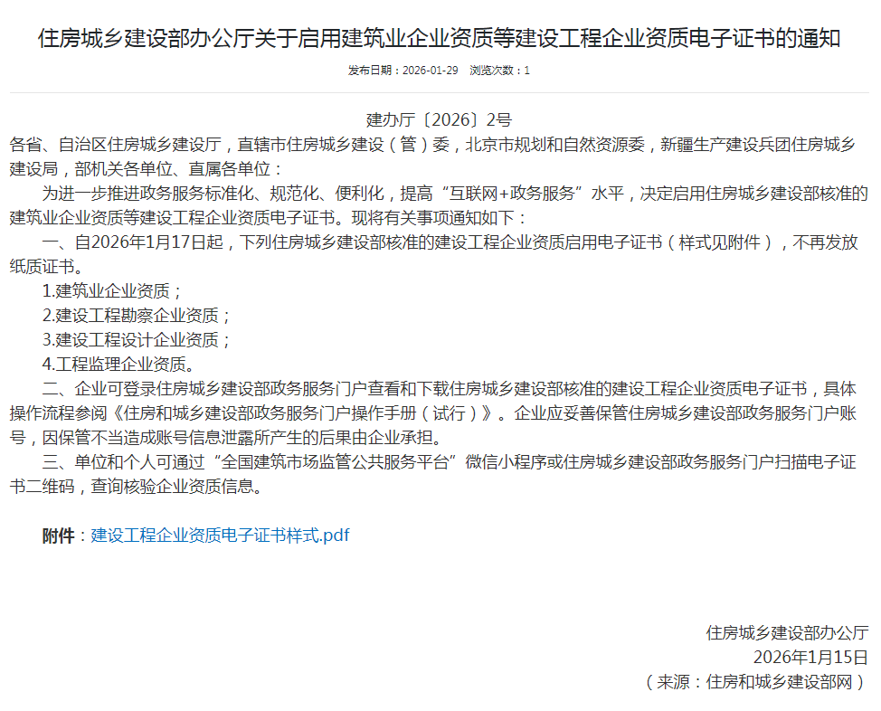 住房城乡建设部办公厅关于启用建筑业企业资质等建设工程企业资质电子证书的通知