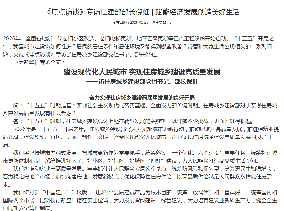 《焦点访谈》专访住建部部长倪虹 | 赋能经济发展创造美好生活