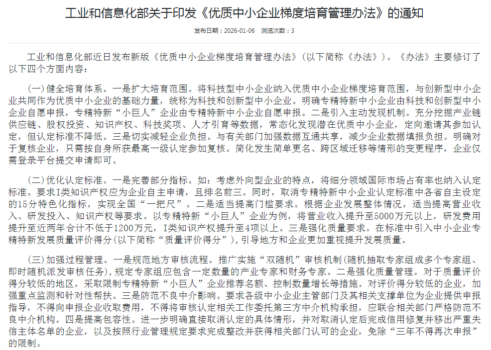 工业和信息化部关于印发《优质中小企业梯度培育管理办法》的通知